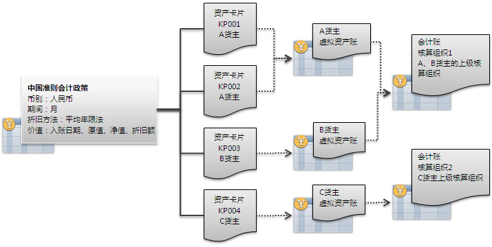 从会计政策维度看,在同一个会计政策下,各资产类别采用的折旧方法、折旧政策、折旧年限原则上是相同的,但具体到每个卡片时允许修改。一个会计政策下管理的各资产卡片价值,类似于一个独立于总账的虚拟资产账。