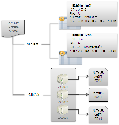 从资产卡片维度看,同一张卡片支持多会计政策,不同政策下财务信息不同,但实物信息共享。